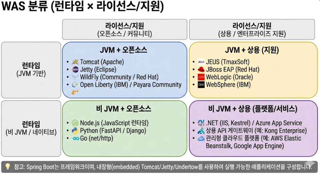 아래는 많이 사용하는 WAS 솔루션들을 런타임/라이선스 별 분류 및 각각의 특징을 카드 형태로 정리하였습니다.