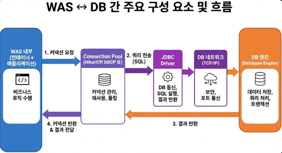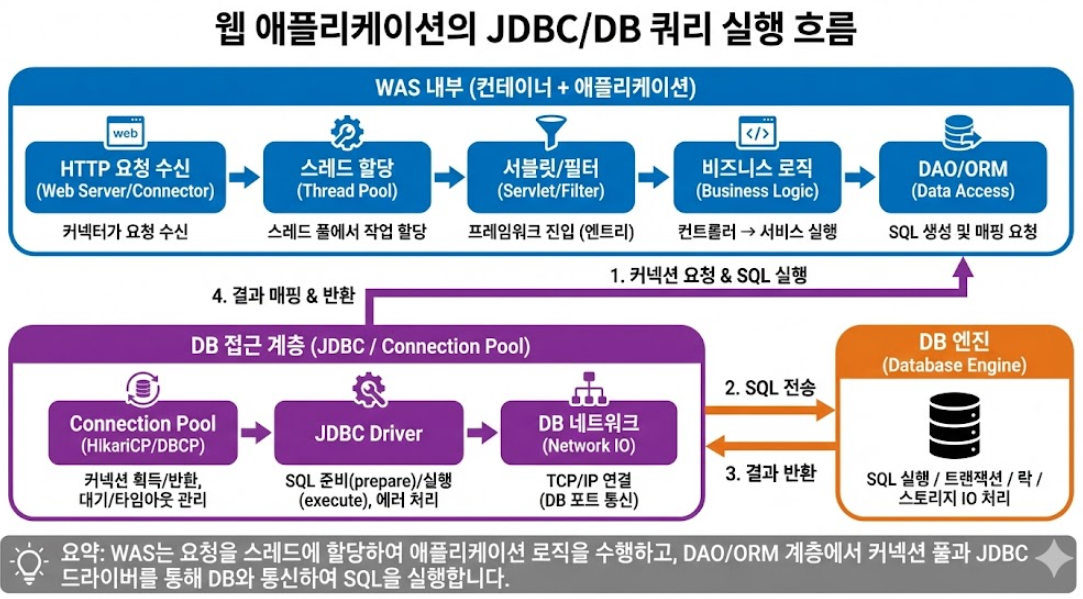 WAS는 요청을 받아 스레드에 할당하고, 애플리케이션 코드(컨트롤러/서비스/DAO)가 실행됩니다. DB가 필요하면 커넥션 풀에서 커넥션을 얻고 JDBC 드라이버로 SQL을 보내며, DB 엔진이 실행 결과를 반환합니다.